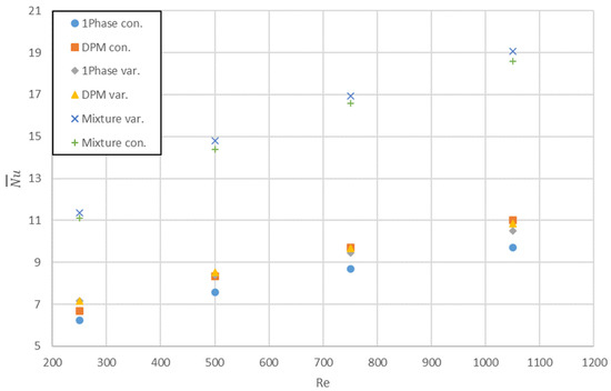 Saha and Paul [40] studied the influence of nanoparticle size, NPC, and Brownian motion on heat transfer and WSS during the turbulent flow of a nanofluid inside a uniformly heated tube. The single-phase approach with k-ε turbulence model was applied to solve governing equations. It was established that heat transfer is more affected by the diameter of nanoparticles and Brownian motion than the thermal conductivity of a nanofluid. Bianco et al. [41] studied the influence of NPC on the turbulent flow of nanofluids in tubes with a constant wall temperature. A mixture model of nanofluid with k-ε turbulence model was adopted. Although Nu number increases with NPC increase, PD increases more, so the application of nanofluids is questionable. In [42] Saha and Paul applied a Eulerian–Eulerian multi-phase mixture model to analyze the turbulent flow of nanofluids in a uniformly heated tube. It was found that heat transfer performance determined by the multi-phase mixture model is better than the single-phase model [40]. Aghaei et al. [43] simulated the effect of NPC and nanoparticle diameter on the turbulent behavior of nanofluids during flow in tube with a constant temperature. A mixture model with k-ε turbulence model was applied. It was shown that there is an optimum value for the Nu number depending on the NPC. Moreover, the increase of nanoparticle diameter results in a Nu number decrease. Minea [44] studied the turbulent flow of nanofluids in a long tube with an isothermal entrance zone and a uniformly heated section of the developed region. A single-phase approach with the k-ε turbulence model has been applied. It was established that HTC increases monotonically with NPC. Although PP increases with NPC in three case studies, the opposite trend was determined in one case study. Nasiri-lohesara [45] stated that the enhancement of heat transfer with NPC increased during turbulent nanofluid flow inside a tube-in-tube heat exchanger. However, the HTC rate of increase was less than the WSS increase. A mixture model of nanofluid with k-ε turbulence model was applied. Ehsan and Noor [46] established a substantial enhancement of heat transfer during the flow of nanofluid in a rough tube compared to a smooth tube. Moreover, it was shown that there is an optimum value of NPC for which the PP is less than the base liquid. A single-phase approach with an SST k-ω turbulence model was applied. Mahdavi et al. [47] tested different turbulence models by use of a mixture model and DPM implemented in ANSYS-FLUENT code to study the behavior of nanofluids flow in uniformly heated tubes of various lengths and diameters. According to Mahdavi et al. the realizable and standard k-ε models provided the same results in most of the simulations. The Reynolds stress model (RSM) overestimates PD compared with the other k-ε models, while the re-normalization group (RNG) model overestimates HTC. The DPM model is recommended for the discussed cases, however, as it was stressed, the number of particles plays a key role in the simulations. Purohit et al. [48] studied the laminar flow of nanofluids inside a uniformly heated tube by the use of the single-phase approach. It was established that HTC and WSS increase monotonically with NPC increase. Jahanbin [49] used single-phase and dispersion models to study the laminar flow of nanofluids in a uniformly heated tube. Moreover, in both models, constant and temperature dependent properties of nanofluids were tested. It was established that dispersion model shows better agreement with the existing experimental data than the single-phase model. Elahmer et al. [50] studied the laminar flow of nanofluids in a tube with a wall loaded with constant or periodic heat flux. A single-phase approach was applied. Regardless of the method of heating the wall of the tube, HTC increased with NPC increase. Albojamal and Vafai [51] conducted simulations of laminar nanofluid flow in a tube with a uniformly heated wall. A single-phase model, the Lagrangian–Eulerian model (DPM), and the mixture model were adopted with both constant and temperature-dependent properties of nanofluids. It was observed that the DPM model overestimated the HTC. The mixture model predicted unreasonable heat transfer enhancement, particularly for high NPC. The single-phase model displayed a very good agreement with the experimental data. It was established that HTC increases with NPC and Re number increase, but it is punished by PD and WSS increases. Finally, it was concluded that the proposed single-phase model reproduces the experimental data with sufficient accuracy and there is no need for two-phase models. In Figure 5, results of numerical calculations by the use of the single-phase (1Phase) approach and two two-phase models, namely DPM and mixture, with constant (con.) and variable (var.) thermophysical properties of nanofluid, are shown.