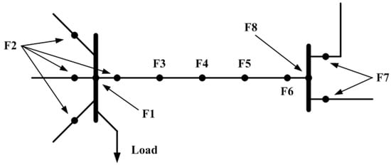 The selection of the different fault positions is based on the characteristics of sag, which are considered for the study of interest. Sag duration and magnitude are considered in this example. Fault positions F1 (indicating faults on the bus bar in the substation) and F2 (faults nearer to the bus bar) lead to the same magnitude of sag, but their fault-clearing times are different. Hence, two fault positions have been selected. The fault positions (F2, F3, F4, and F5) along the line have different magnitudes of sag but similar fault-clearing times. Fault positions F6, F7, and F8 result in different durations of sag but the same magnitude. For all fault positions, magnitude, duration, and frequency are determined. It is noted that all the fault positions need not be an equal fraction of the distance along the line. The length (x) between fault positions for any lines originating from the substation is given by Equation (1) [2].