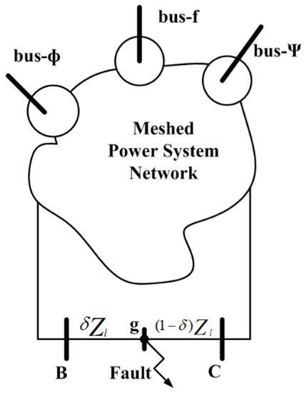 We will now focus on a position of fault g that moves throughout a considered line, joining buses B and C. As shown in Figure 3, the location of g is where the occurrence of a fault is determined by the use of an introduced parametric quantity, δ. The value of parametric quantity δ lies between 0 to 1 concerning the movement of the location of the fault from bus B to C.