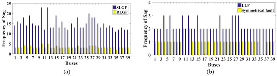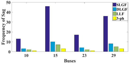 The frequency of sag concerning different types of faults for the same randomly chosen buses, 10, 15, 23, and 29, is shown in Figure 17. It is identified that the maximum and minimum frequencies of sag were due to a single line to ground fault and a three-phase fault, respectively.