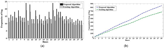 The comparative analysis of the proposed algorithm with respect to the existing algorithm is shown in Figure 7. Figure 7a shows the frequencies of sags due to the SLGF, and Figure 7b indicates the cumulative changes of voltage sags in the proposed and existing algorithms.