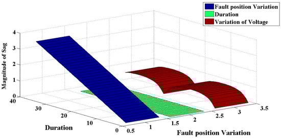 The three-dimensional ribbon plot of sag magnitude for different fault positions at a fixed duration of 80 ms is shown in Figure 9.