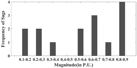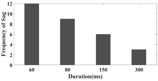 Figure 13 indicates the plot between the frequency of sags and the durations of the faults. From the graph, it is concluded that the maximum frequency of sag is associated with the lowest time duration, which was 60 ms. The frequency of sag concerning the duration and magnitude ranges are shown in Table 4 and Figure 13. From Table 4 and Figure 13, it is observed that the maximum frequency of sag associated with the highest magnitude range was 0.7–0.9 per unit and the lowest time duration was 60 ms.