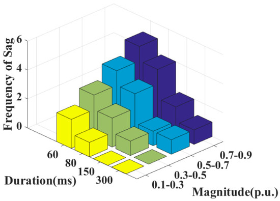 The assessment of voltage sag was performed on the considered real distribution network for every available bus. The frequency of sags concerning different magnitudes of duration for any usual bus 10 is shown in Figure 11 and Figure 12.