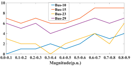 From Figure 15 and Table 5, it is concluded that the frequency of sags is greater for the lower sag time duration and less for the comparatively more extended period. Furthermore, it is identified that the frequency of deep sags is less than that of shallow sags. A fault causes deep sags in the lower magnitude voltage part of the network, which affects only the neighboring consumer. In contrast, the shallow sags occur due to the faults in the transmission lines, and their consequences spread over a broader part of the distribution system. The maximum frequency of sags was 66 annually, and the minimum was 18 for bus 15 and bus 10, respectively. The sag frequency of the four randomly chosen buses, 10, 15, 23, and 29, is presented in Table 6 and Figure 16.