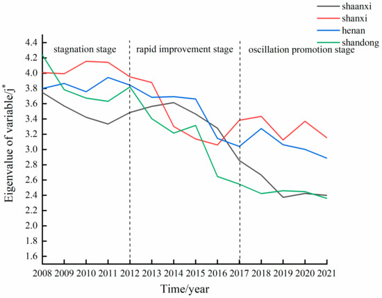 It can be seen that from 2008 to 2021, the grades of the four provinces fluctuated along a trend from worse to bad to medium to good. The eigenvalues generally showed a decreasing trend, which indicated that the carbon neutrality capacity of the four provinces has generally improved. The value of the highest comprehensive correlation degree constantly fluctuated, which in turn created fluctuations in the grades of the four provinces in their transformation processes.