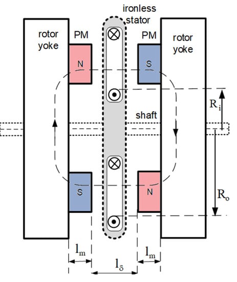 - Choi, J.-Y.; Lee, S.-H.; Ko, K.-J.; Jang, S.-M. Improved Analytical Model for Electromagnetic Analysis of Axial Flux Machines with Double-Sided Permanent Magnet Rotor and Coreless Stator Windings. IEEE Trans. Magn. 2011, 47, 2760–2763. [Google Scholar] [CrossRef]