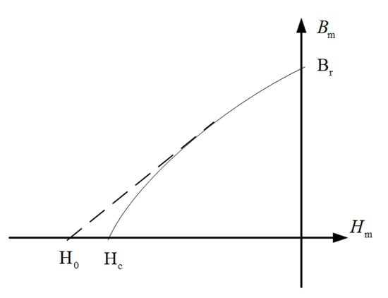 In this paper, a linear approximation of the Permanent Magnet demagnetization characteristics was assumed (according to Figure 3 where and ). To simplify considerations, the authors have also neglected the iron magnetic voltage drops. This dependence, according to occurring quantities, differ for selected magnet types, changing the magnetization curve influencing on the generator work.