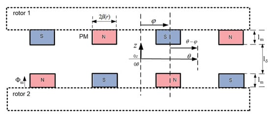 For machines with a coreless disc structure and the rectangular magnets shape, basing on the exemplary literature [7,9,10,11,13,14,16,17,19,39,40], analytical formulas presenting the distribution of flux density in the air gap have been applied. The cross-section of AFPMG is presented in Figure 1 and Figure 2, and Figure 4 presents a basic model defining symbols used to determine the magnetic field distribution.