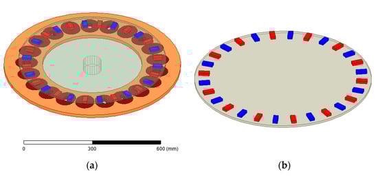The structure of the tested generator, modelled in ANSYS Maxwell software, is presented in Figure 6 and in Table 1. The FEM analysis was performed using the ANSYS Maxwell software. The transient and magnetostatic analysis methods were used. The work temperature was set to 22 °C. The total number of mesh elements was 857,643 (compaction depends on the element). The assumed rotational speed was 206 rpm (48 Hz). The authors also had at their disposal the previously discussed [39,40,41] laboratory model of the generator, with NdFeB magnets (Figure 7), which served as a reference point in the presented analyses.