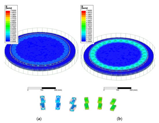 The first analysis was obtained for block magnets with the same size (10 × 18 × 40 mm) for all magnet materials. The detailed mathematical description of the flux density distribution and determining the EMF for this model construction was fully described in [9,11,19,40] and briefly discussed in Formulas (1)–(12), pointing the influence of the magnets’ parameters on output parameters. The flux density plots (for the whole generator and selected Permanent Magnets) obtained from 3D magnetic analysis for selected magnet types are shown in Figure 8a,b.