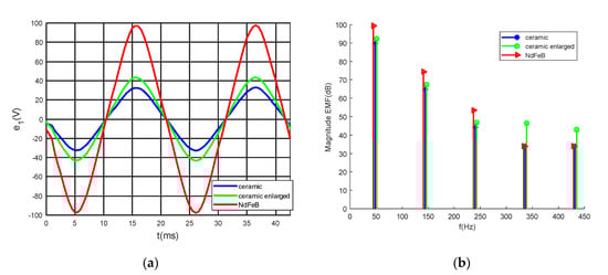 To obtain a higher output voltage and compare the total magnets price for analysed construction, the authors performed further tests with different magnet volumes. The assumed ceramic magnets height was three time bigger then NdFeB magnets while the width and length were constant. The electromotive forces (EMF) and stator currents were obtained from FEM transient analysis for selected magnet types and sizes are shown in Figure 9 and Figure 10. The presented spectra (in dB) are for the adopted reference levels: 1 mV for voltages; 0.1 mA for currents.