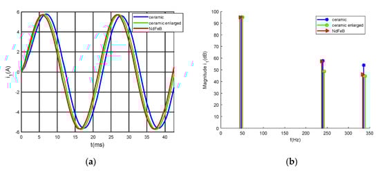 Stator current (phase 1) for generator at nominal load for different magnet types: Ceramic; Ceramic enlarged and NdFeB (a) Waveform; (b) FFT spectrum.