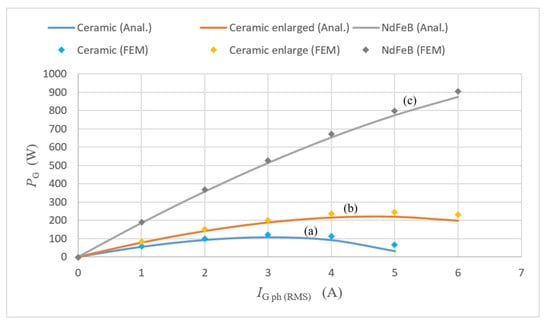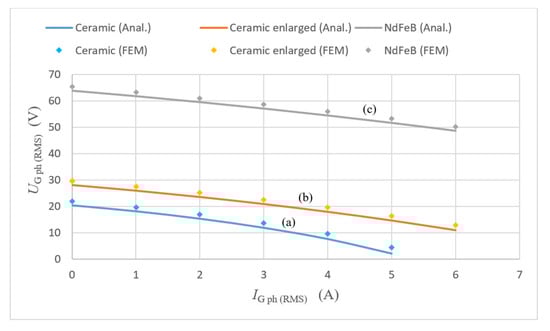 From analysing Figure 11, one can see that the generator voltage drop is smaller for the NdFeB (about 14%) and ceramic magnets with enlarged size (about 34%) than in the case of ceramic magnets with the basic size (about 56%) for current load IG ph (RMS) = 4 A.