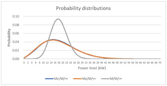Table 6 shows the different service levels and the power contractual level associated with the 99% service level according to the three different models. It is clear how the introduction of the arrival lot instead of the simpler case of unit arrivals gives a more pessimist result. The differences in service level calculations are related to the fact that the Mn/M/∞ and Mx/M/∞ models provide a flatter probability distribution of states than the M/M/∞ model, as can be observed in Figure 3. In particular, models associated with a higher degree of realism and complexity expect a larger probability of exceeding the contracted power level.