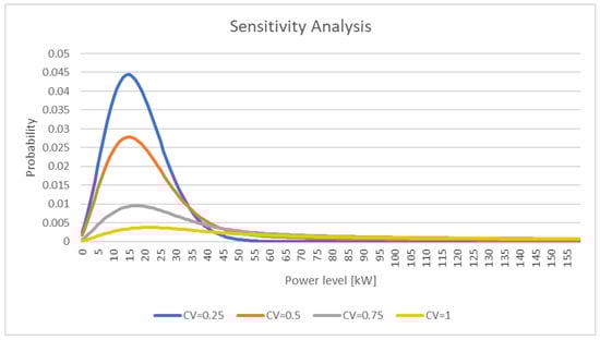 The second sensitivity analysis was performed to assess the impact of variability in arrival lot size. Specifically, alterations were made to the CV value, which directly impacts the magnitude of the standard deviation of the normal distribution governing lot size. Three different alternative CV values to the original 0.25 were evaluated: 0.5, 0.75 and 1. As can be observed in Figure 6, by increasing the variability of the distribution of the lot size (i.e., by increasing the CV), the probability distribution of the states of the system becomes increasingly flat. This behaviour, as also noted in the previous section, results in a higher probability of contracted power level overruns (i.e., a deterioration in service level).