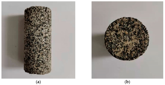 The standard core of SCGPCS was put into a phase permeability tester (XSY-3, Haian Petroleum Research Instruments Co., Ltd., Nantong, China) for water and gas permeability testing, and the average value was taken and accurate to 0.1 mD. The test circumferential pressure was 2.50 MPa, the displacement pressure was 0.20–0.30 MPa, and the test time was 30 min. The permeability is calculated by Darcy’s law: