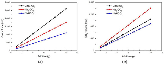 Effect of gas-generating agent addition on the volume of generated gas. (a) Gas volume. (b) CO2 volume.