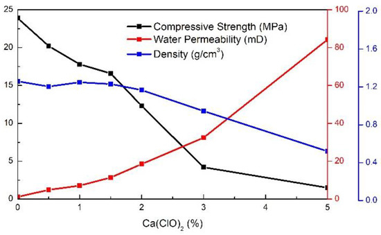 Figure 4 shows that the volume of gas generated inside the cement stone increases with the increase in calcium hypochlorite mass concentration. The increase in pore space inside the cement stone core leads to the increase in permeability. When the mass concentration of calcium hypochlorite is greater than 1.5%, the permeability of the cement stone core increases, while the compressive strength decreases. This is because the larger the internal pore space of cement stone under a certain pressure, the more easily the space structure is destroyed, and the compressive strength will be reduced [29,30].