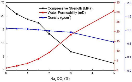 Figure 5 shows that the permeability of cement stone core increases with the increase in sodium carbonate mass concentration, while the compressive strength decreases. The permeability of sodium carbonate + aluminum sulfate gas-generating system is smaller than that of calcium hypochlorite + urea gas-generating system under the same amount of addition. The reason is that calcium hypochlorite + urea gas-generating system generates large volumes of gas. At the same time, a sodium carbonate + aluminum sulfate gas-generating system generates gas and precipitation, and the precipitation will block the pore structure of the cement stone, resulting in a decrease in permeability.