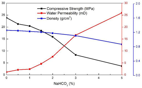 Figure 6 illustrates that the volume of gas generated increases with the increase in the mass concentration of sodium bicarbonate, resulting in an increase in the permeability of the cement stone. When the mass concentration of sodium bicarbonate in the cement slurry is greater than 0.5%, the precipitation generated by the reaction blocks the microscopic pores inside the cement stone, resulting in a decrease in permeability. When the mass concentration of sodium bicarbonate continues to increase, the effect of the generated gas on the increase in cement stone permeability is enhanced, and the effect of precipitation on the decrease in cement stone permeability is weakened.
