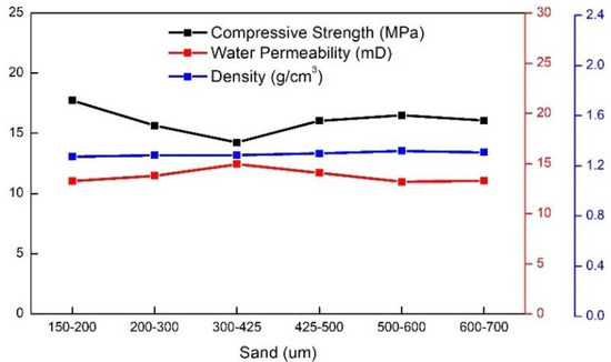 Figure 7 indicates that the permeability of permeable cement stone increases first and then decreases with the increase in sand particle size. The permeability of permeable cement stone core is greatest when the quartz sand particle size is 300–425 μm. The quantity of sand of the same quality decreases with the increase in sand particle size, which reduces the accumulation between sands. The permeable cement stone consolidated more tightly, and the permeability decreases, while the compressive strength of permeable cement stone increases. Sand with particle size 300–425 μm is selected as the permeable cement stone structuring strength substance.