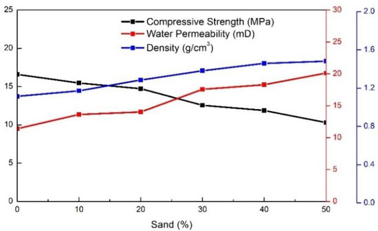Figure 8 shows that the permeability of permeable cement stone increases with the increase in sand mass concentration, and at the same time the compressive strength decreases. The increase in the amount of sand increases the volume of accumulation between the particles. It makes the porosity inside the cement stone increase and improves the permeability of the cement stone. The optimum mass concentration of sand is 30%.