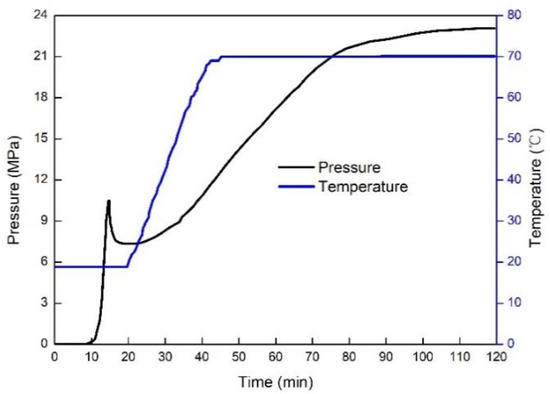 Figure 11 shows that the change curve of internal temperature and pressure of graphene–foam–cement slurry during hydration. The internal temperature of graphene–foam–cement slurry was maintained at about 20 °C until 20 min. The hydration reaction started to exotherm and the internal temperature of graphene–foam–cement slurry started to increase after 20 min. The internal temperature of cement stone reached 69 °C at 42 min and was maintained at this temperature. The internal pressure of graphene–foam–cement slurry is also changing with time. The pressure is 0 MPa at the beginning of hydration, reaches a small peak of 10 MPa at 14 min, and then drops back to 7 MPa. The pressure continues to increase with time after 27 min and reaches 23 MPa at 120 min. The CO2 generated inside the graphene–foam–cement slurry is in a supercritical state after 25 min, when the temperature exceeds 31 °C and the pressure exceeds 7.3 MPa.