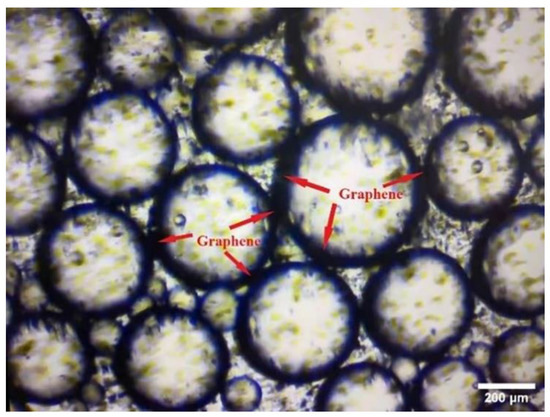 Figure 12 illustrates that the graphene is uniformly distributed within the liquid film on the foam surface. Graphene nanosheets are adsorbed into the liquid film of the foam to improve the strength of the liquid film and enhance the stability of the foam. The interaction between the graphene nanosheets adsorbed into the liquid film forms a spatial network structure, which reduces the liquid film drainage and bubble aggregation rate, and enhances the foam stability [32,33]. The high dispersion of graphene nanosheets forms uniformly dispersed nanofoam. The graphene nanosheets gathered on the surface of the foam can conduct the heat out of the foam quickly.