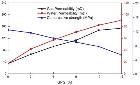 Figure 13 shows that the gas permeability and water permeability increased with the increase in GPG mass concentration. The maximum gas permeability reached 154.3 mD and the water permeability reached 90.65 mD. The addition of GPG increased the bubble stabilization ability of CO2 bubbles, which made the bubble dispersion more uniform and stable. The graphene–foam–cement slurry formed a more stable porous material after consolidation, which improved the permeability. The compressive strength decreased with the increase in GPG mass concentration. More pore structure will reduce the structural strength of cementite, resulting in a decrease in compressive strength. The optimum mass concentration of GPG is 6%. The water permeability of permeable cement stone is 57.24 mD, and the compressive strength of permeable cement stone is 10.19 MPa.