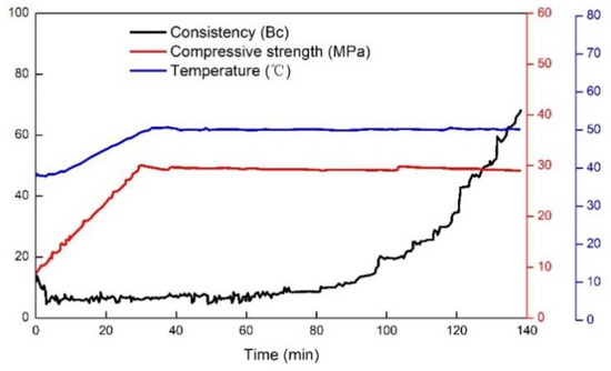 The mixed cement slurry was poured into the slurry cup. The slurry cup was placed into the an atmospheric consistometer (HTD125, Qingdao Haitongda Special Instrument Co., Ltd., Qingdao, China), which recorded the temperature, pressure, consistency curve, and experimental data in real time. This could be output from an external data interface to an external computer, where the computer screen displayed the experimental curve while the test results were finally printed out by a color printer. An atmospheric consistometer can automatically control the rate of temperature rise (temperature gradient) and maintain a constant temperature when the cement slurry reaches the set temperature with an accuracy of <1 °C (33.8 °F). At the same time, it can automatically control the rate of pressure rise (pressure gradient) and the pressure in the kettle is provided by a pneumatic ultra-high-pressure pump and maintained by a pneumatic control valve.