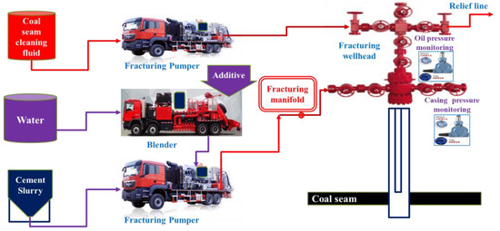 Based on the physical characteristics of coal structure as primary-fractured coal and cuttings development, the SCGPCS system was used for coalbed methane fracturing to achieve the stimulated reservoir volume (SRV) of coal seam. In the first step, the coal seam-cleaning fluid was injected into the pores and natural fractures of the coal seam to dissolve water-insoluble inorganic and organic materials, clear the pore throat and increase the permeability. In the second step, graphene–foam–cement slurry was injected into the coal seam at high pressure to open the end cuttings and face cuttings. A three-dimensional microfracture network with ultra-thin and super-large surface was formed. Nano CO2 foam, graphene aerogel and high permeability cement stone support the microfracture network. At last, coalbed methane was desorbed from the support fracture surface through self-generated thermal desorption and self-generated CO2 replacement of SCGPCS. Figure 19 shows the flow chart of On-site fracturing operation.