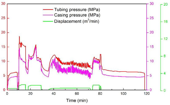 1. Coal seam cleaning fluid was injected into the formation through the oil pipe for 13 m3 with a displacement of 1.3–1.5 m3/min. The tubing pressure decreased from a maximum of 19 MPa to 16 MPa, and the casing pressure decreased from a maximum of 14 MPa to 9 MPa, indicating that the coal seam cleaning fluid entered the coal seam to improve the permeability.