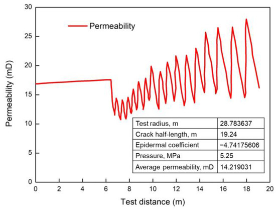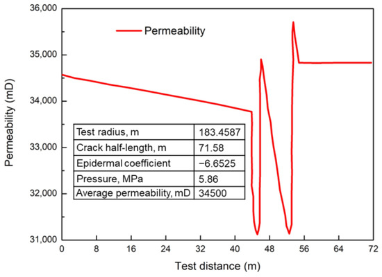 Figure 21 presents the pressure drop test of the coal seam cleaning fluid. The crack half-length of the coal seam treated with the coal seam cleaning fluid was 19.24 m. The average permeability of the treated coal seam was 14.22 mD. Figure 22 illustrates the dynamic fracturing crack pressure drop testing of graphene–foam–cement slurry fracturing. The fracturing crack half-length was 71.58 m. The average permeability in the fracturing crack was 34,500 mD. Figure 23 shows the static fracturing crack pressure drop testing after graphene–foam–cement slurry fracturing. The supported fracturing crack half-length was 56.95 m. The supported fracturing crack permeability near wellbore was 56.265 mD. This is in good agreement with the permeability of SCGPCS in the laboratory (57.24 mD). The unsupported fracturing crack permeability in crack tip was 4.29439 mD.