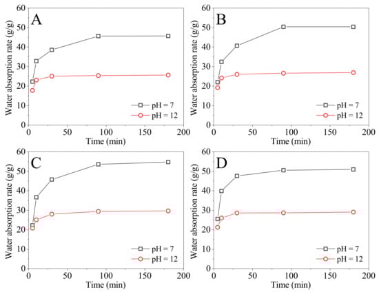 The absorption rates of SAPs prepared with different monomer concentrations tested at 90 °C in water (pH = 7) and in NaOH solution (pH = 12) varied with time; the monomer concentrations are (A) 21.00%, (B) 26.25%, (C) 35.00%, and (D) 52.50%.