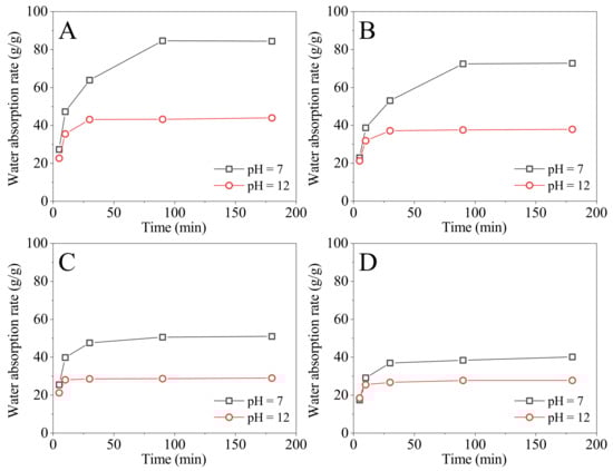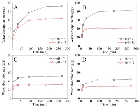 The four SAPs are considered to be saturated with water at 270 min, from Figure 2. The saturated absorption rates and the pH-sensitive index () are summarized in Table 4. From Table 4, the saturated absorption rate of the SAPs in water and in NaOH solution (pH = 12) decrease as MBA dosage increases. When the MBA dosage increases from 0.143% to 1.001%, the absorption rate of the SAPs in water reduces from 91.50 to 41.43 g/g, while the absorption rate in NaOH solution (pH = 12) decreases from 62.78 to 25.66 g/g. This is because MBA increases the cross-linking density of the SAP, lowering its absorption rate. increases initially and subsequently reduces as MBA dosage increases, reaching a maximum when the MBA dosage is 0.429%. The maximum is 2.01. Therefore, the preferred MBA dosage is 0.429%.
