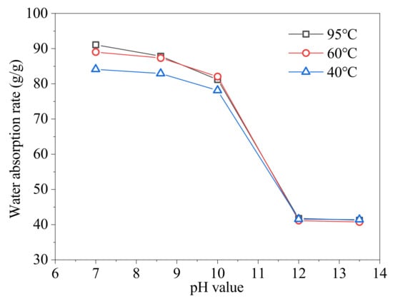 The absorption rates of the SAP at various temperatures and pH values are shown in the Figure 4. From Figure 4, temperature has little effect on the SAP’s absorption rate, which decreases slightly as the temperature decreases from 95 °C to 40 °C at the pH value range of 7 to 10. It has almost no effect on the absorption rate in the pH range of 12 to 13.5.