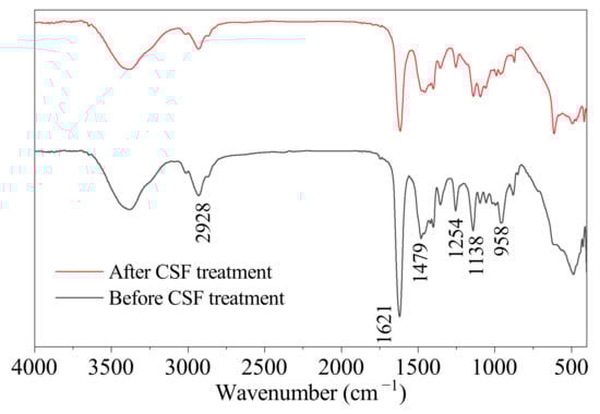 FTIR spectrum of the SAP before CSF treatment and after CSF treatment for 300 min at 90 °C.