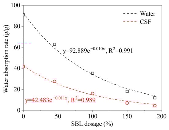 According to a previous study [34], the particle size and absorption rate of SAP were factors that affected its self-healing effect. Styrene–butadiene latex (SBL) was added to the polymerization solution to adjust the SAP’s absorption rate. The amount of SBL added was the ratio of the solid phase weight in SBL to the monomer weight. The effect of SBL dosage on SAP’s absorption rate was studied, as shown in Figure 8. From Figure 8, the absorption rate of SAP in water and in CSF at 90 °C decreases with the increasing dosage of SBL. This is mainly because the latex particles are not water absorbent. The absorption rate of the SAP has a good exponential functional relationship with SBL dosage. The functional relationship between the SAP’s absorption rate in water and the SBL dosage is: . The functional relationship between the SAP’s absorption rate in CSF and the SBL dosage is: . Therefore, the SBL dosage can be determined using functional relationships to prepare the SAP with the required properties.