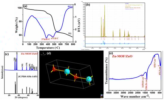 (a) TG-DTA; (b) XRD; (c,d) Rietveld refinement and its crystallographic structure; and (e) FT-IR of the prepared Zn-MOF/ZnO.