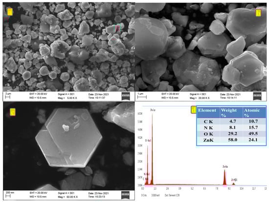 (a–c) SEM images at various magnifications at 5, 20, and 50 k; (d) EDX spectrum of prepared Zn-MOF/ZnO.