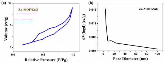 (a) Nitrogen adsorption/desorption isotherms; (b) Pore size distribution of the Zn-MOF/ZnO.