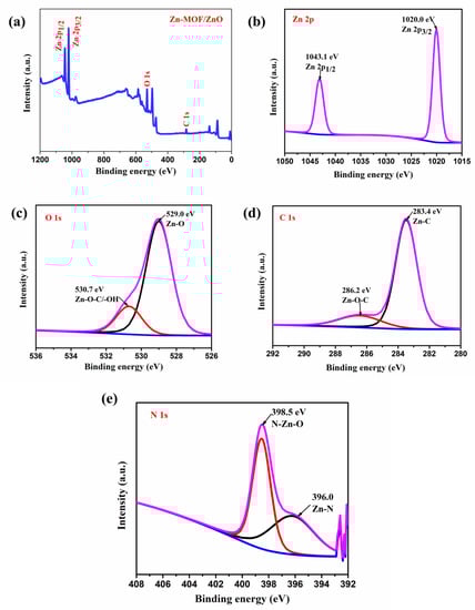 (a) XPS spectrum of the prepared Zn-MOF/ZnO survey spectrum; high resolution spectra of (b) Zn 2p state; (c) O 1s state; (d) C 1s; (e) N 1s.