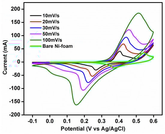 Comparison of three electrode cyclic voltammetry of bare Ni-Foam at 10 mV s−1 and Zn-MOF/ZnO as working electrode at 10-100 mV s−1.