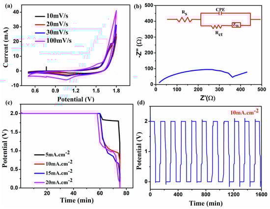 (a) CV; (b) EIS; (c) GCD plateau (second cycle) at 5-20 mA.cm−2; (d) initial 10 charge-discharge cycles of the prepared material in the newly designed flow cell.