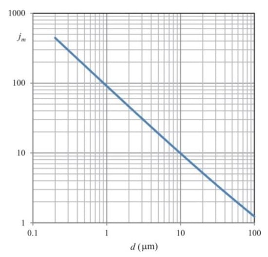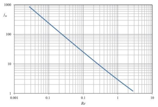 Due to the fact that the diameter of a particle (droplet) is a characteristic dimension, it would be appropriate to present the dependence of jm with regard to the droplet’s diameter. An exemplary graph is shown in Figure 3. The analysis of the obtained dependence showed that the value of the Colburn modulus decreases with an increase in the droplet diameter.