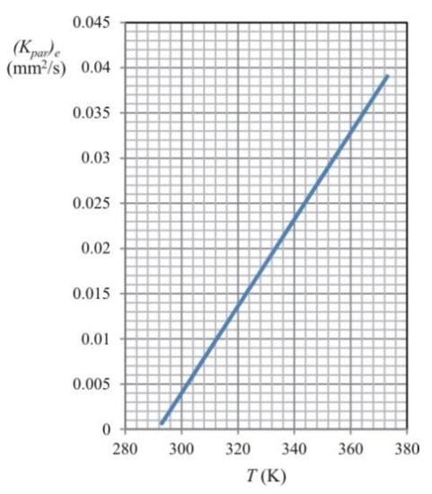 The droplet’s evaporation time t results from Equation (7), i.e., from the D2-law of droplet evaporation. The concept of the effective evaporation constant, which is described by Equation (11), is very convenient from a practical point of view. The graph of the dependence between the effective evaporation constant and the temperature, which was obtained by extrapolating the data presented in the paper of Chin and Lefebvre [], is shown in Figure 4.