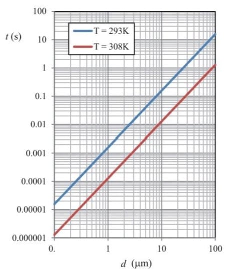 The values of the droplet’s evaporation time at selected ambient temperatures and for droplets of different diameters calculated from Equation (11) are shown graphically in Figure 5. The obtained results confirm the observations conducted for the sprayed liquid stream [,]. In the case of the standard velocity of the aerosol flowing through the dust duct of even 120 m/s (usually from 20 to 25 m/s), the droplets in the stream should be observed at a distance of 1 m from the outlet of the apparatus supplying the system with the liquid containing the catalyst (e.g., nebulizer, reactor). Under such flow conditions, the droplet’s lifetime should be above 0.0084 s.