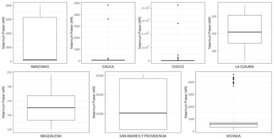 Regarding the maximum power per shire county, it can be concluded from Table 2 and Figure 2 that, as expected, the shire county of San Andres y Providencia on average had the highest power represented by 64% (14021 kW) with respect to the shire counties studied. In second place was Chocó with 18% (3925 kW), followed by the shire counties of Amazonas and Vichada with 11% (2295 kW) and 5% (1194 kW), respectively. These values can be directly linked to the size or number of non-interconnected localities present in each shire county studied.