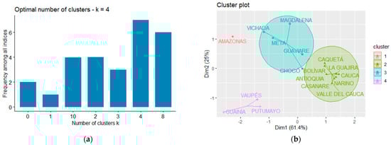 The data was then analyzed with the K-medoids algorithm with a “Manhattan” distance measure; this measure is theoretically more robust than the Euclidean one since it is not affected to a large extent by outliers. It can be seen in Figure 4a that changing the distance measure suggests another number of clusters using the function fviz_nbclust, thus, Figure 4b shows the creation of four clusters. Contrasting the clusters obtained in Figure 3b and Figure 4b shows that the shire county of Amazonas was done in a single cluster and only the internal validation by the Silhouette index below will tell which of the two analyses is more accurate. Table 4 (below) shows the representative information for each new grouping of shire counties and the corresponding variables; from this Table, detailed numerical information can be obtained for each of the 4 clusters. In Table 4, it can be seen that the Amazonas shire county, belonging to a single cluster, has very similar values to those it had when it was part of the closest cluster in the previous analysis (Figure 3b and Table 3), this shows a broadly incorrect grouping that will be confirmed in the course of the investigation.